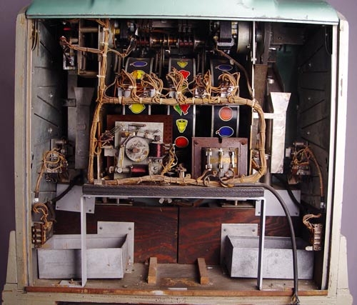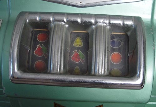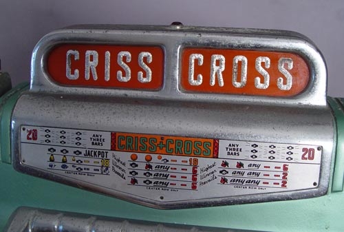 1940'S KEENEY CRISS CROSS SLOT MACHINE WITH BASE: Massive electro-mechanical slot machine made by Keeney in the 1940's. Machine takes nickels or quarters. Lights up and wheels spin when plugged in. Unsure of complete working condition. Note 5 cent light not working. On original base with glass Criss Cross panel. Comes with keys. Measures 61'' high x 32 1/2'' wide x 16 1/2'' deep. Buyers and sellers in the following states may not participate in antique slot machine sales due to laws prohibiting slot machine ownership in their state: Alabama, Connecticut, Hawaii, Indiana, Nebraska, South Carolina, and Tennessee.