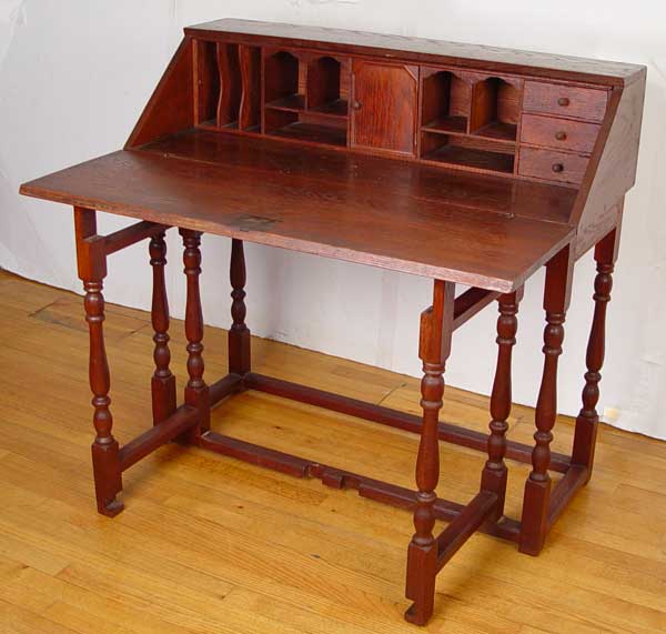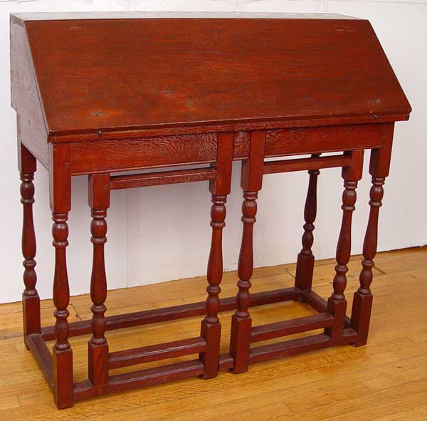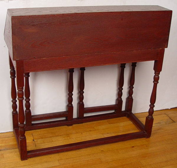 ENGLISH FALL FRONT BUREAU / DESK ON STAND: Original iron hinges and unique swing leg door. Peg construction. Measures 39 1/2'' high x 41 3/4'' wide x 17'' deep.