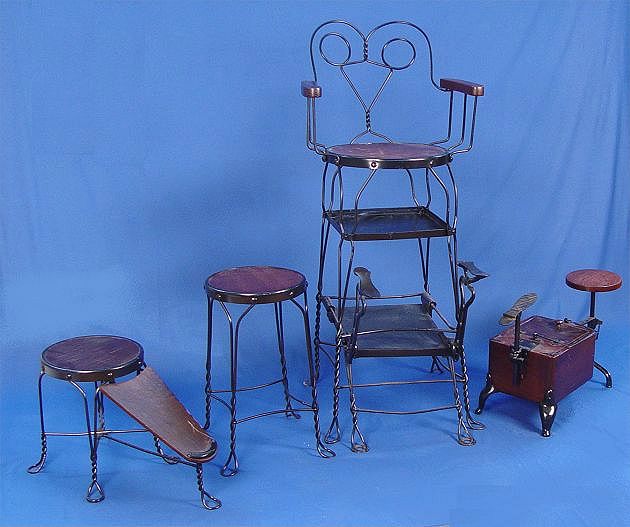 4 PIECE WROUGHT IRON SHOE SHINE STANDS: 1) High client chair, 51 1/2'' high x 23'' wide x 34'' deep, 2) Stool, 22'' high x 20'' dia., 3) Foot stool, 15'' high x 23'' long x 12 3/4'' wide 4) Shoe shine box, 15 1/2'' high x 28 1/2'' long x 10 1/2'' wide.