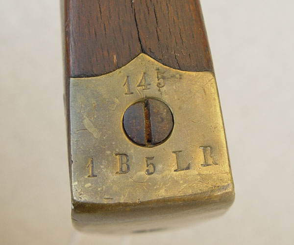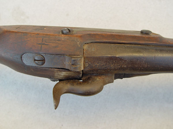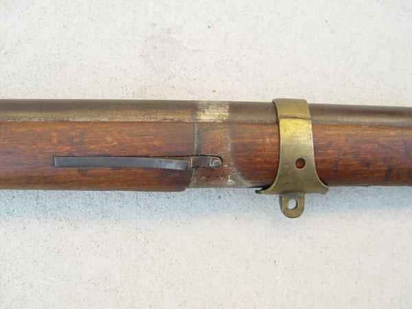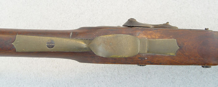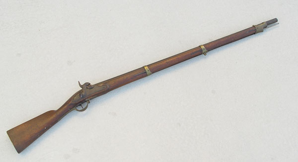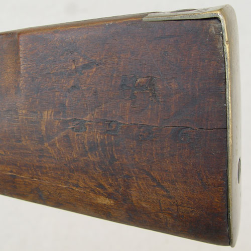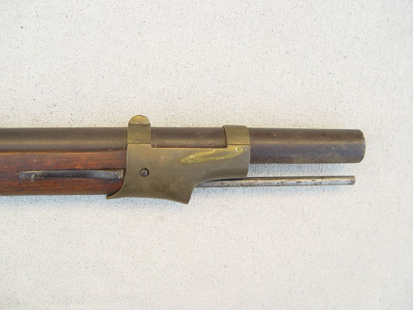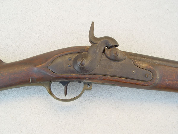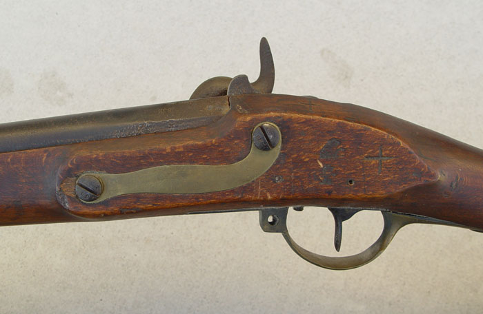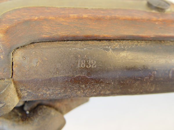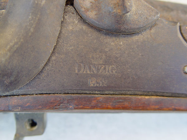 M1809/39 DANZIG GERMAN PERCUSSION RIFLE DATED 1832: Popular during the Mexican and American Civil War. Smoothbore .75 caliber round barrel with 1832 date. Walnut fullstock with spring release 3 brass bands. Blade site on 3rd band. Lock is marked with crown / Danzig / 1832 and works perfectly. Brass S shaped sideplate. Brass buttplate marked with regimental markings. Barrel measures 41 1/2'', overall 56 1/2''. Please note moderate pitting on barrel at breech, several gouges and one small split on butt stock.