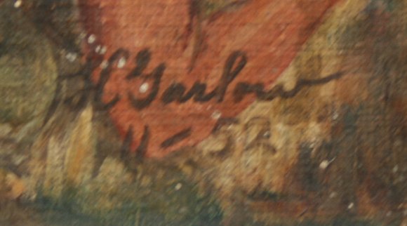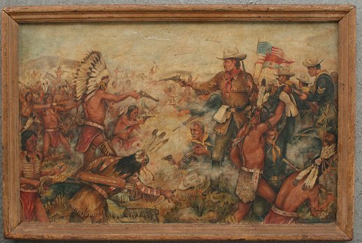 PRIMITIVE CUSTER'S LAST STAND OIL/B: 13'' x 20'', signed H. Garlow/dated '52, framed, 15 1/2'' x 21 1/2''. Needs cleaning, abrasion in upper margin.