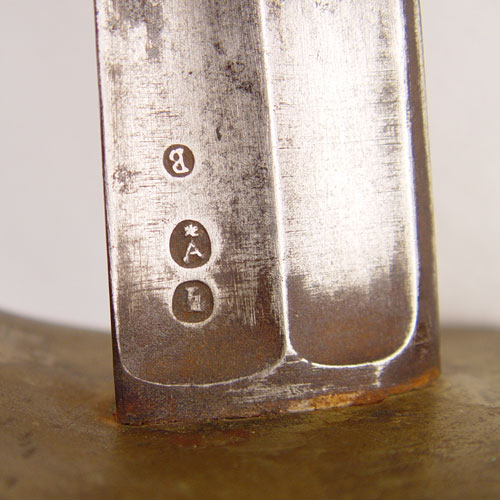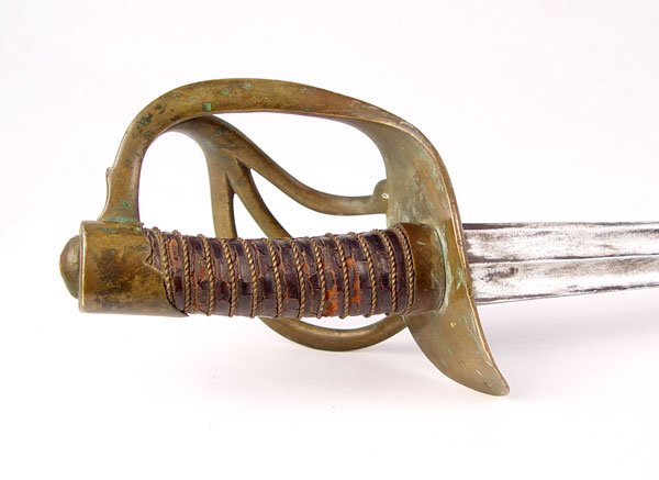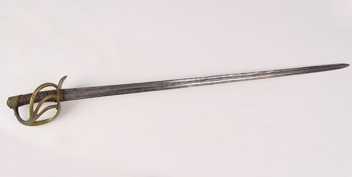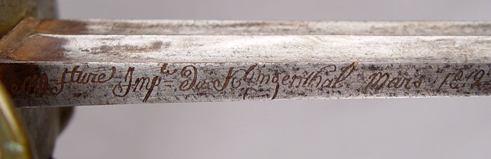 1812 FRENCH NAPOLEONIC CUIRASSIER CAVALRY SWORD: Brass hilt with original leather wrap and twist wire, nice and tight, note cracking condition of leather. Marked Klingenthal and dated 1812 on spine of blade, likely saw use at the Battle of Waterloo. Blade also marked with armatures stamps and inspector stamp. Multiple inspector stamps on blade and hilt. Double fuller runs full length of 37 5/8'' blade. Overall length 44''. Est. $800/1200**