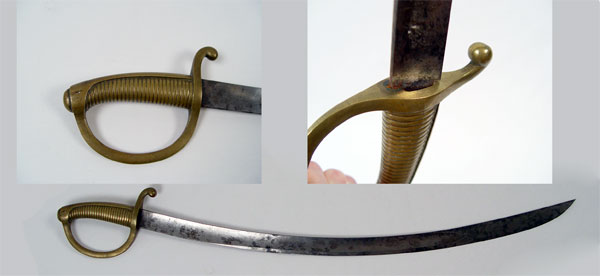 PRE CIVIL WAR IMPORT BRASS HILT ARTILLERY SWORD: Circa 1840's French import. All brass hilt and grip with curved blade. No makers name or stamp. No scabbard. Blade measures 25 1/2'', 30 3/4'' overall. Please note areas of age staining on blade.