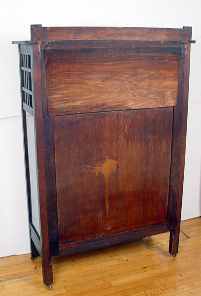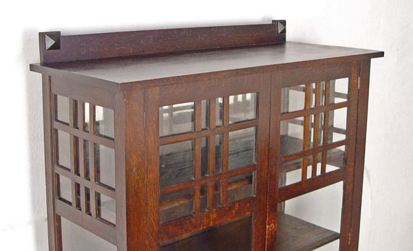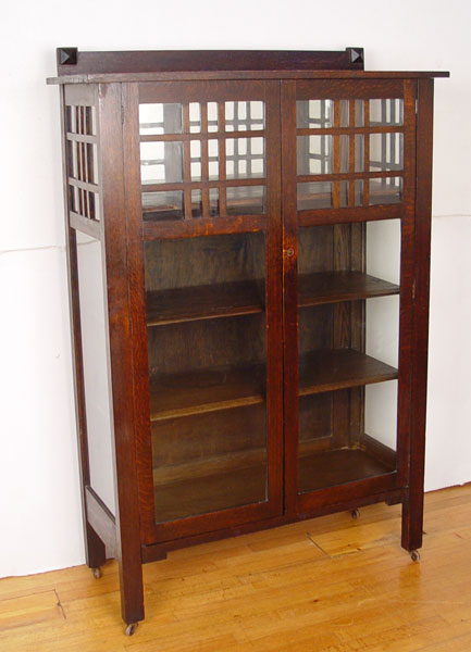 PERIOD ARTS & CRAFTS DOUBLE DOOR BOOKCASE: Classic arts & crafts lines. Glass doors and sides. 3 wood shelves. Measures 62 1/4'' high x 41'' wide x 16'' deep. Note minor looseness.