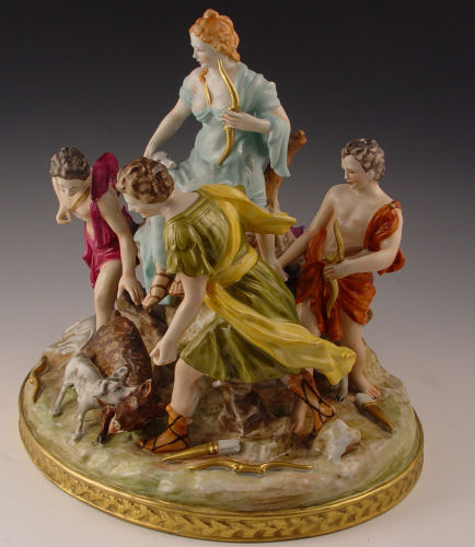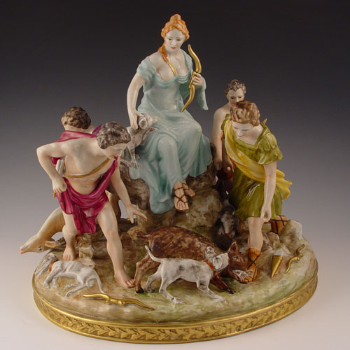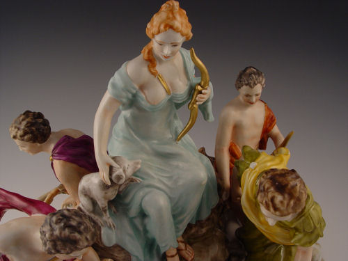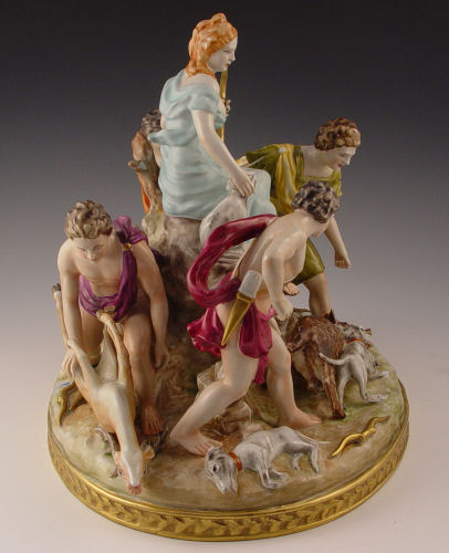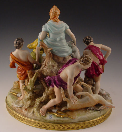 MEISSEN QUALITY PORCELAIN FIGURAL GROUP: Very active 5 figure group with animals, 12''h, 13'' dia. Blue cross swords mark.