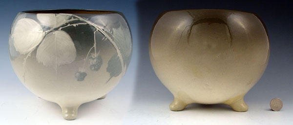 ROSEVILLE ART POTTERY LIGHT COLORED ROZANE JARDINIERE: Tri-footed, 7''h, 7'' dia. at the rim.