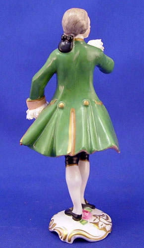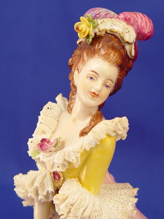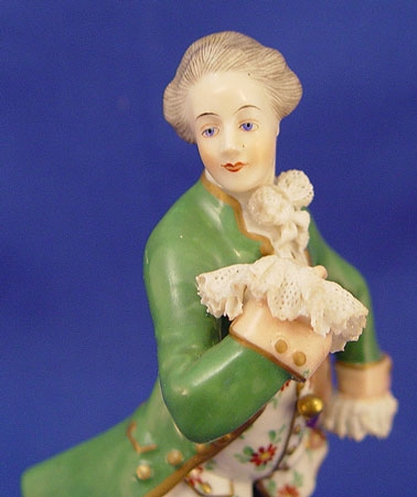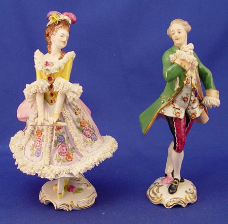 FINE VOLKSTEDT GERMAN PORCELAIN FIGURINES, MAN AND WOMAN: Dressed in lace adorned finery, her with a fan, him with a walking stick. Each with the Volkstedt mark. 8'' tall.