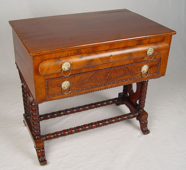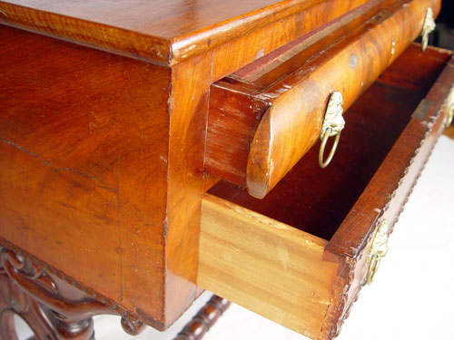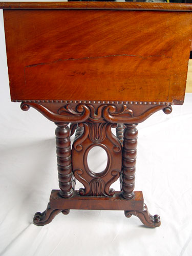 FLAME GRAIN MAHOGANY VICTORIAN WRITING TABLE: Two drawers with the upper having a leather top interior. Carved side panel legs joined by stretcher. 29'' high x 31'' wide x 19 3/4'' deep.