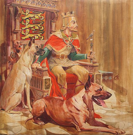 ILLUSTRATION SIGNED CURRAN OF GREAT DANES WITH SCANDINAVIAN KING ON HIS THRONE: Oil/B, 18'' x 18'', signed, worn frame, 21 1/2'' x 21 1/2''. Needs cleaning.