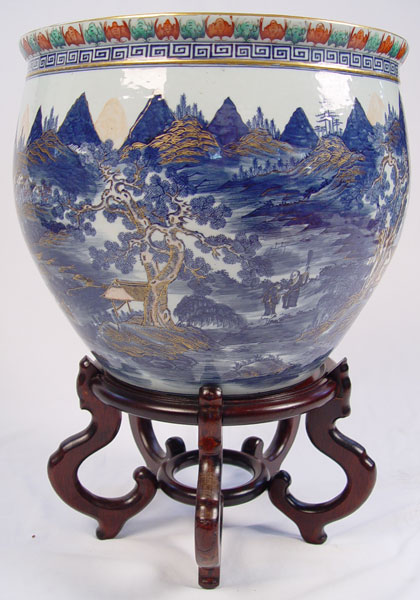 EARLY 20TH C. CHINESE PORCELAIN FISH BOWL: Cobalt scenic landscape exterior, interior decorated bubble eye goldfish. Bowl measures 16'' high x 18 3/8'' top dia. Stand 9 3/4'' high.