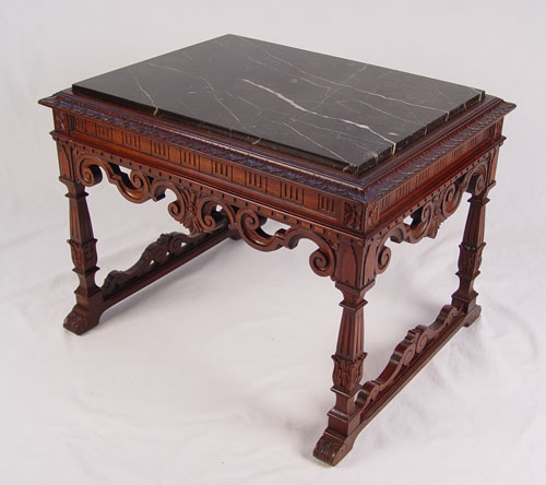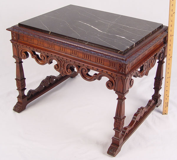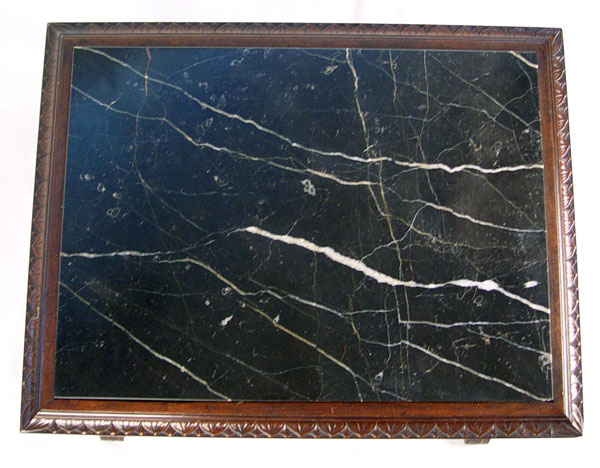 BLACK MARBLE TOP CARVED SIDETABLE: Measures 20 1/4'' x 26 1/4'' x 18 1/2''