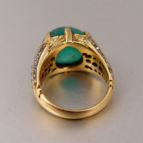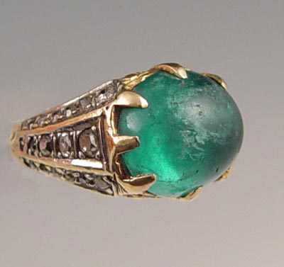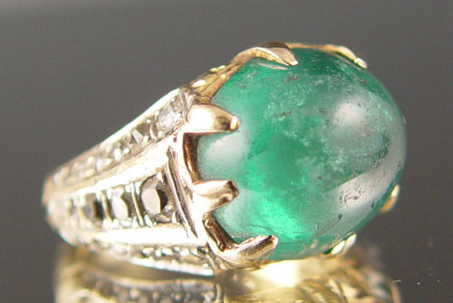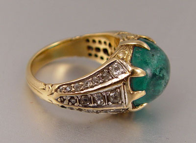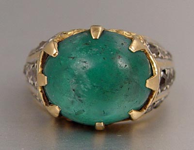 18K 8.50 CT. CABOCHON EMERALD RING WITH DIAMONDS: 18K yellow gold ring contains one oval shaped cabochon cut emerald. WEIGHT: 8.50 Ct. Approx. Rated SI in clarity (Type III), slbG in Hue, 4 in Tone and 3-4 in Saturation. 37 old mine cut diamonds (one diamond is missing). TOTAL WEIGHT: .50 Ct. Approx. The diamonds average SI in clarity and I-J in color. The emerald and diamonds are prong set. Weight: 8.9 grams.
