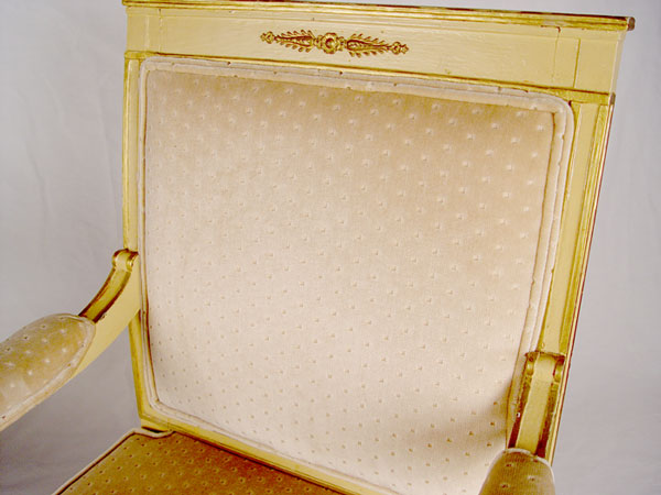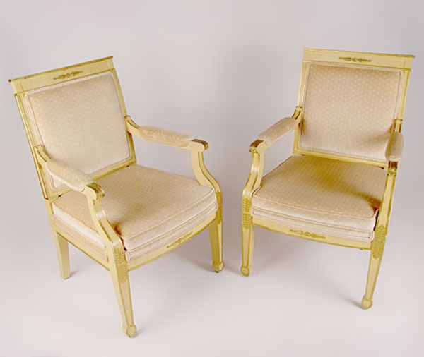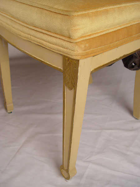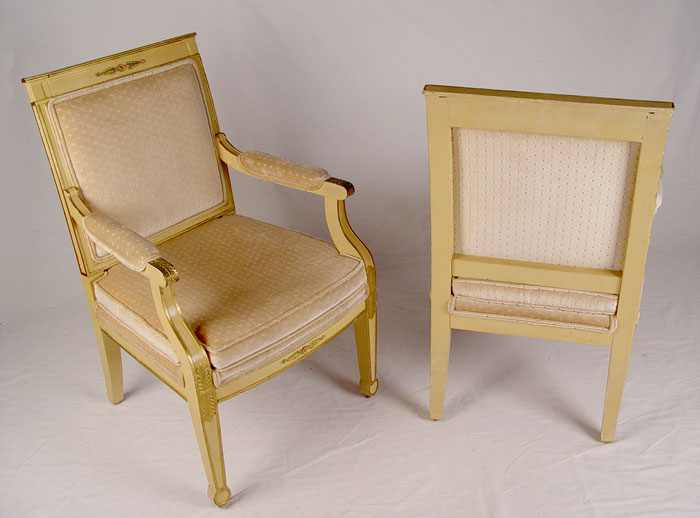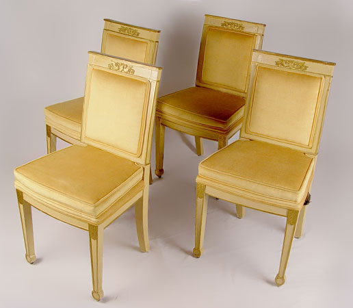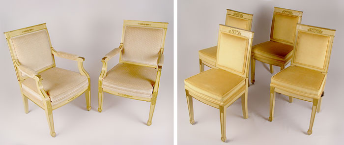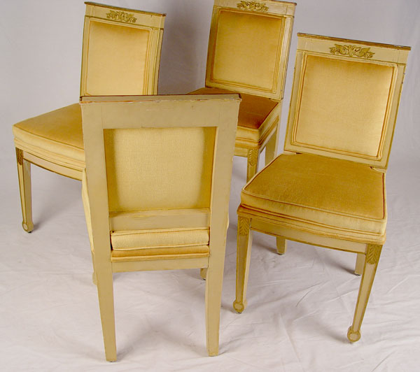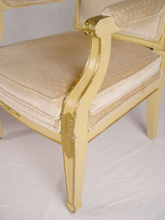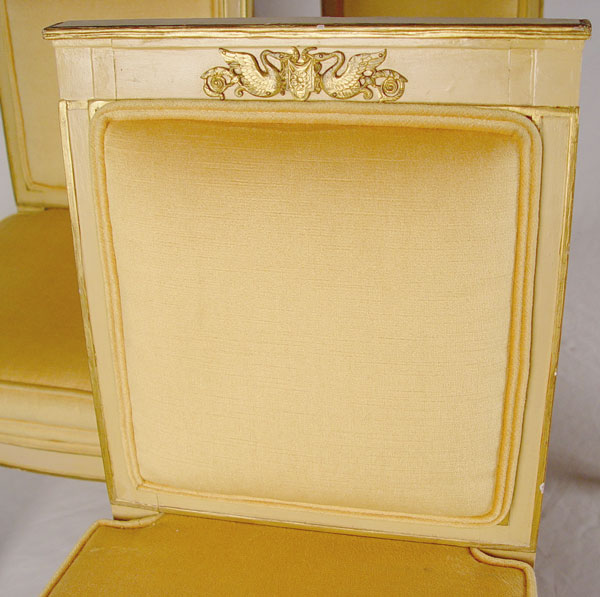 6 NAPOLEONIC FRENCH DINING ROOM CHAIRS: Swan form ormolu on the top rails. Paint worn finish, upholstered backs and seats. Two arm chairs, 4 side chairs.