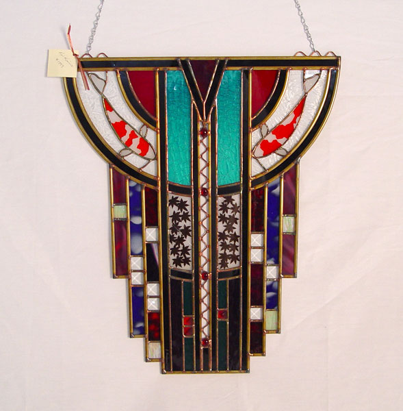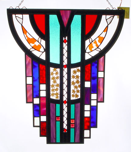 JACK ROSEMAN CONTEMPORARY ART GLASS WINDOW: Contemporary stained glass featuring koi fish, ''Koi Kimone''. Please note cracked panel. Measures 21 1/2'' x 18 1/2''.