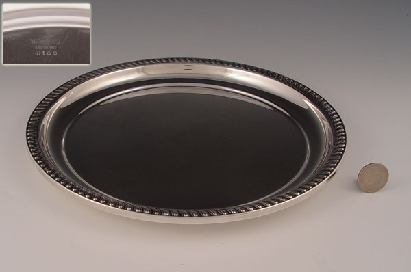 QUAKER STERLING TRAY: Rope design outer rim. Marked with Quakers Silver Co. hallmarks, ''Sterling 0100''. Measures 10 3/8'' dia. Approx. 18.3 troy oz.