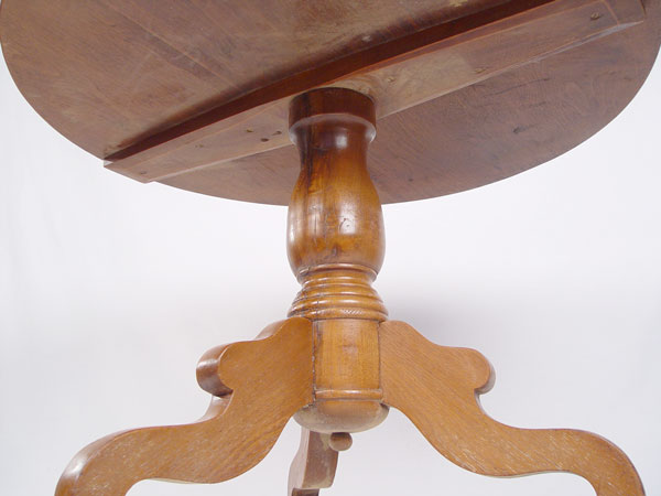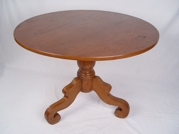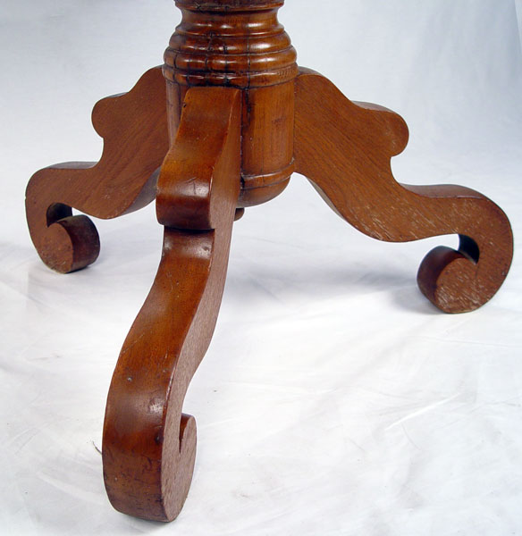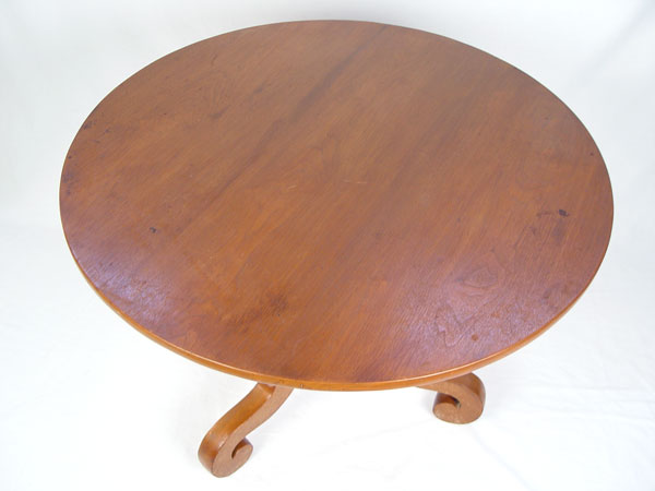 19TH CENTURY BREAKFAST TABLE: Round cherry? table, turned pedestal joins scrolled legs. 29'' high x 40'' dia.