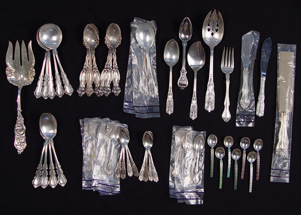 48 PIECE ASSORTED ESTATE STERLING FLATWARE LOT: 48 sterling pieces to include 1) Russian silver table spoon. 2) 6 Simpson, Hall and Miller fruit spoons monogrammed. (6''). 3) 4 Reed & Barton teaspoons monogrammed (6''). 4) 4 Reed & Barton soup spoons monogrammed (6''). 5) 7 demitasse spoons with enamel design handles, note bend in two. Hallmarked CVK. ( 3 1/4''). 6) Amston meat fork (9''). 7) 19 piece Westmorland ''Milburn Rose'' pattern: 14 demitasse spoons, 6 in original bags (4''); 2 sugar spoons in original bags (6''); jelly server (6 1/4''); tea spoon (6''); master butter knife (6 3/4''); pierced serving spoon (8 1/4''). 8) 7 Westmoreland George & Martha Washington 3 demitasse spoons 3 7/8'', butter knife (6''), steak knife (8 5/8''), salad fork (6''). Approx 36.4 troy oz.