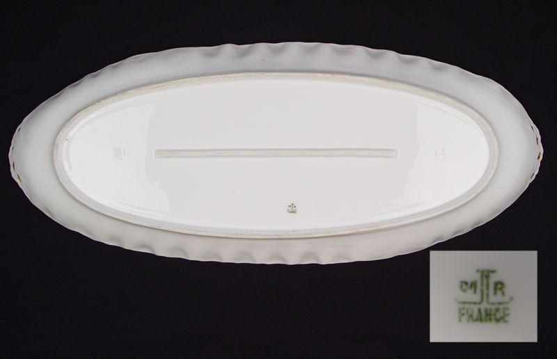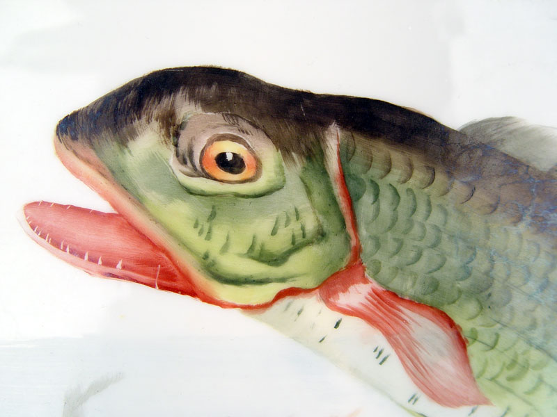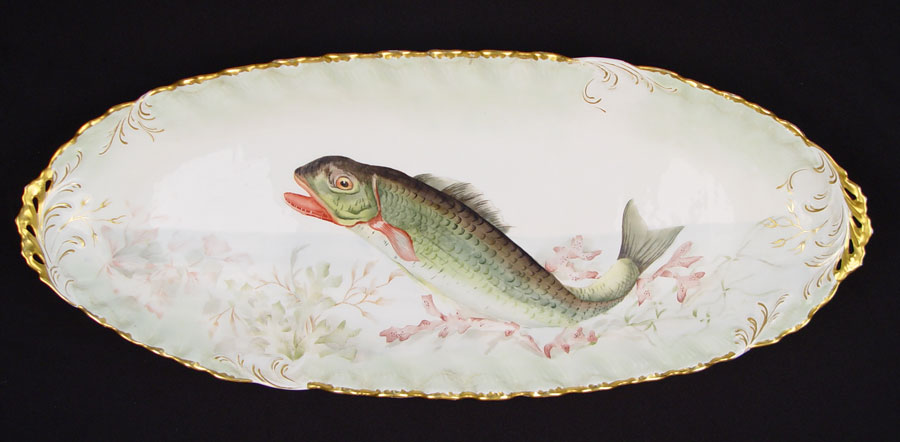 FRENCH LIMOGES HAND PAINTED FISH CHARGER: Martial Redon circa 1891-1896. Hand painted decor, pierced handles. Please note wear on gilt edging. Measures 23 5/8'' x 9 1/2''.