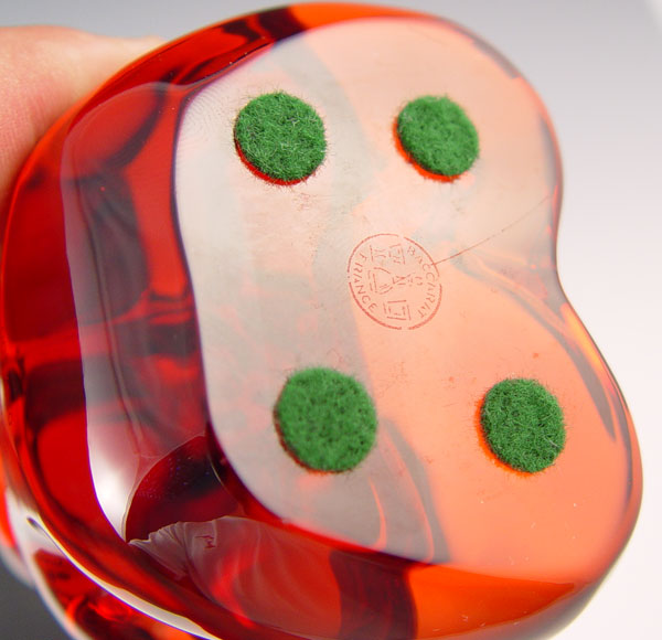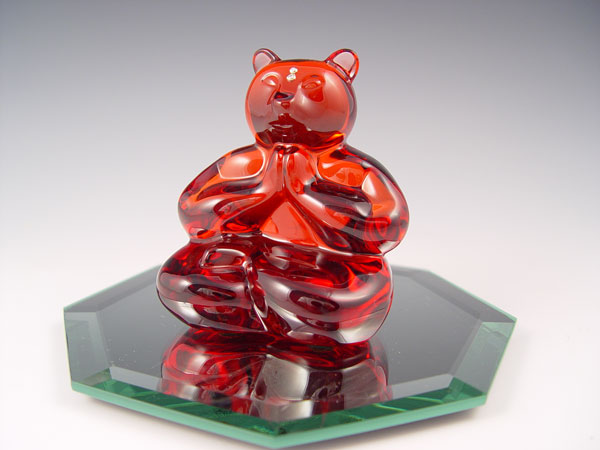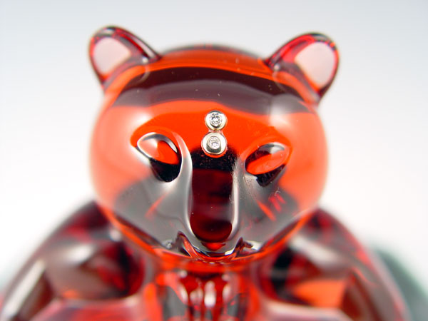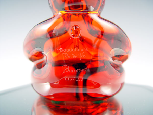 BACCARAT RUBY BOUDDHOURS BEAR WITH DIAMONDS: Ruby red glass ''Bouddhours'' incense holder bear with 2 diamond chips in forehead. Designed by Phillipe Di Meo. Limited edition #16/100. Measures 3 1/2'' high.