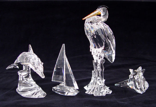 SWAROVSKI DOLPHIN, SAILBOAT, SEASHELL & HERON: 4 piece lot to include 1) Heron with black glass top feathers and yellow glass beak, note beak appears to have very tip missing, measures 5 3/4'' high. 2) Dolphin on waves, measures 3 1/2'' high. 3) Whelk sea shell, measures 1 3/4'' high. 4) Sailboat, note flag broken off at top, measures 3 3/8'' high. All have original boxes