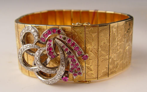 18K YELLOW GOLD, DIAMOND AND RUBY RETRO BRACELET: Ca. 1945-1955. A wide 18K yellow gold segmented bracelet with chased floral design. Applied white gold brooch contains 47 round single cut diamonds. TOTAL WEIGHT: 1.00 Ct. Approx. rated VS in clarity and G-H in color. 31 round mixed cut rubies (two rubies are missing). TOTAL WEIGHT: .50 Ct. Approx. The diamonds and rubies are prong and bead set. The brooch is soldered to the top of the bracelet. Weight: 110 grams. 7.5'' in length. 1 1/8'' in width. Hidden locking closure with two figure eight safety clasps. 110 grams.