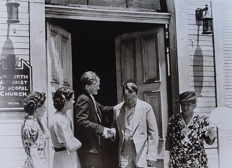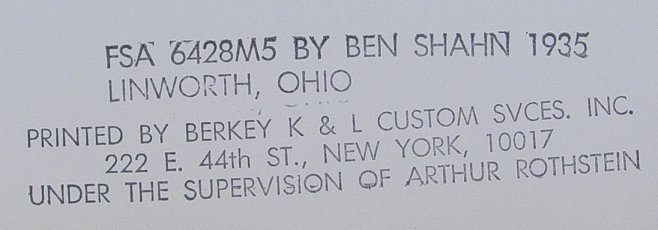 SHAWN, Ben, (American, 1898-1969): FSA Photo 6428M5 Linworth Ohio 1935, 6 1/2'' x 9 1/4'' image size, 14'' x 11'' with margins. Yellowing in upper, left, and lower margins. Stamp titled verso, numbered, dated, and annotated, printed from the original negative under the supervision of Arthur Rothstein by Berkey K & L Custom Services, Inc., NY.