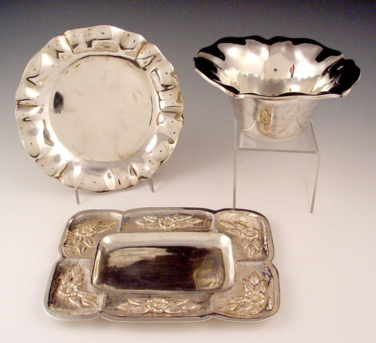 3 PIECE MEXICAN STERLING LOT: To include 1) Maciel tray with repousse flowers around rim. Measures 7 7/8''. 2) Plata M.A.P. flower shaped bowl. Measures 3 3/4'' high x 6 1/2'' top dia. 3) Plata M.A.P. dish. Measures 7 1/8'' dia. Approx. 21.8 troy oz.