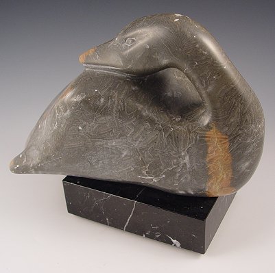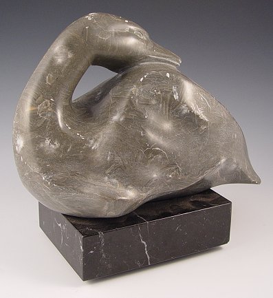 CARVED ALABASTER PREENING DUCK BY RALPH HURST: 8'' x 11'', signed, with abrasions throughout.
