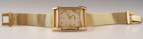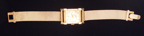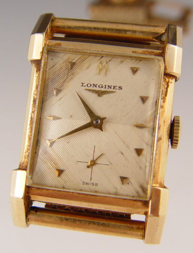 LONGINES 14K GOLD WATCH: Rectangular face with second hand, marked Longines Swiss. 14K gold watch band and case. Face measures 1'', overall length 8''. Approx 58.1 grams overall. Please note condition of face.
