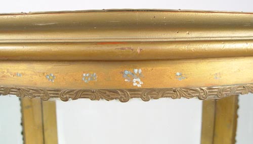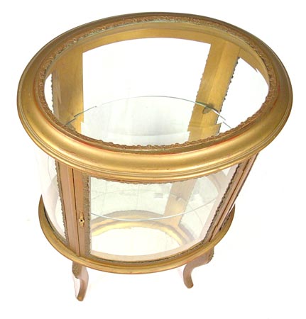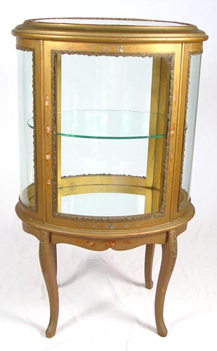 FRENCH VITRINE CURIO DISPLAY CABINET: Oval in shape with beveled glass top. Glass shelf interior, mirror bottom. Painted decoration, ormolu mounts, cabriole legs. 42'' high x 24'' wide x 18'' deep