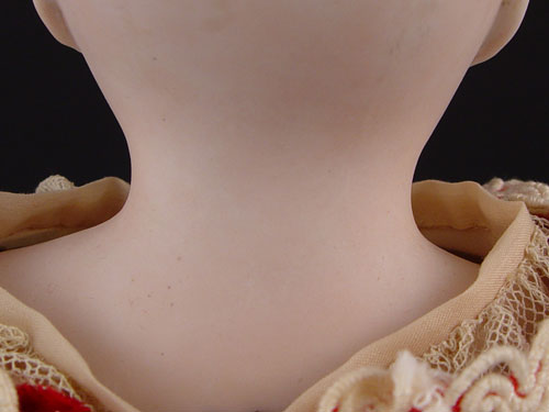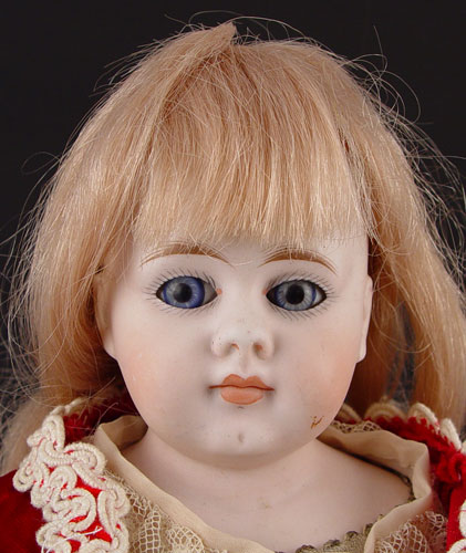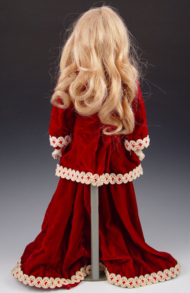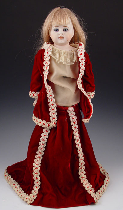 BISQUE SHOULDER HEAD DOLL: Open blue glass eyes, closed mouth, later blond wig. Kid leather body with repairs. Finishing touches to be done on red velvet gown. 19'' high.