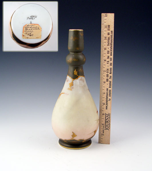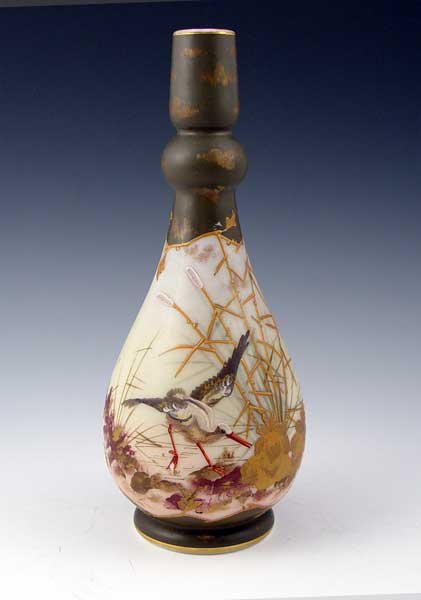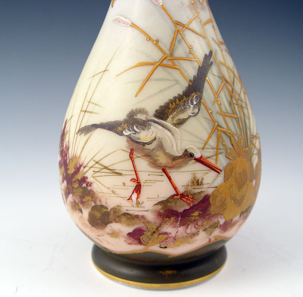 VICTORIAN ART GLASS VASE IN THE MANNER OF SMITH BROS: Hand enameled painted wood stork and reeds design. Measures 10 5/8'' high