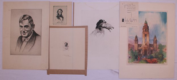 HURLBUT PAPER CO. MULTI PC. PRINT LOT: Bernhardt Wall etching of Abraham Lincoln, full size 9 3/4'' x 4 3/4'', image size 3 3/4'' x 3'', pencil signed/dated 1924, dedicated to Courter A. Miller, 6-9-26; Arthur W. Heinztelman etching of a man, 9 1/4'' x 8 full size, image size 1 1/2'' x 1 1/4'', pencil signed, dedicated to Charles A. White, ed. 100; Roy Rogers portrait etching, 14 5/8'' x 10 1/4'', unsigned, fingerprints in margins; Setter with Pheasant, etching, 14 1/8'' x 11 1/4'', unsigned, water damage in upper margin; Al Mettel Talio-Crome, ''Pantheon'', 11 1/2'' x 8 3/4''; all unframed, sold as is.