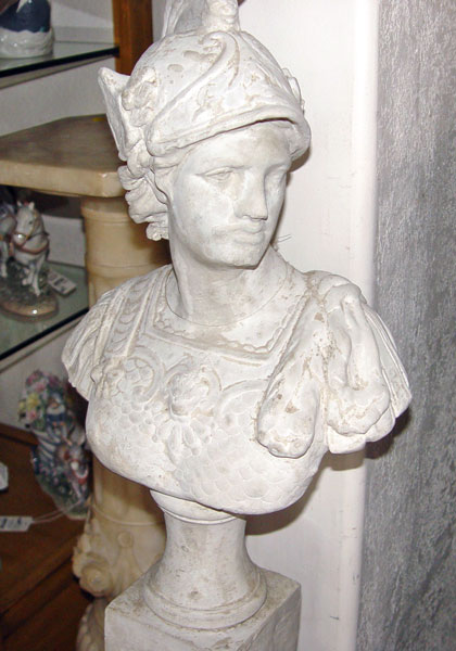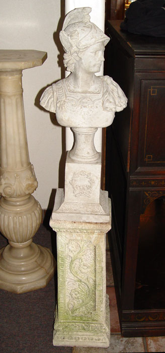 GREEK SOLDIER CONCRETE GARDEN BUST ON PEDESTAL: 52'' tall, including the pedestal base.