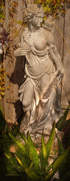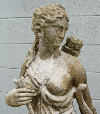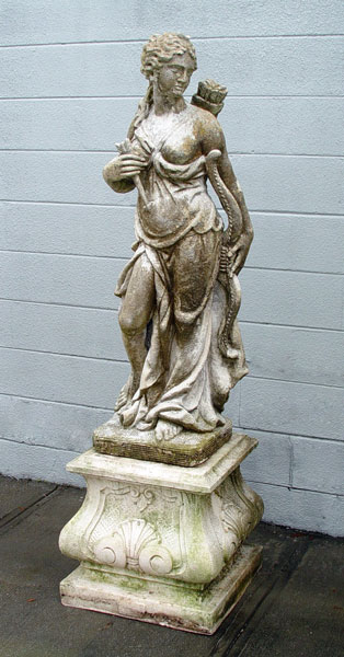 THE GODDESS DIANA CONCRETE GARDEN STATUE AND BASE: 70 1/2'' high overall on stand. Stand measures 20 1/2'' high x 20 1/2'' square.