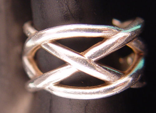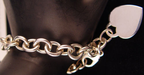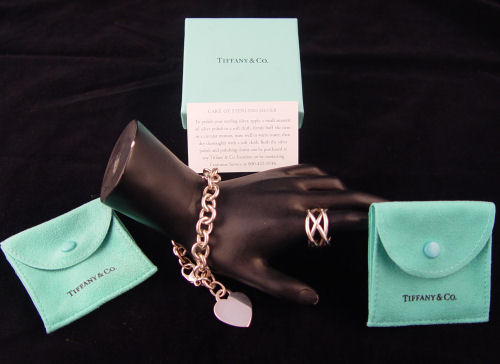 TIFFANY & CO. STERLING RING AND BRACELET: 1) Sterling silver link bracelet with heart shaped charm. Signed Tiffany & Co. 2) Sterling silver ''X'' ring signed T & Co. Size 6.5 Weight: 41.0 grams. Sold with the blue presentation bags.
