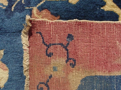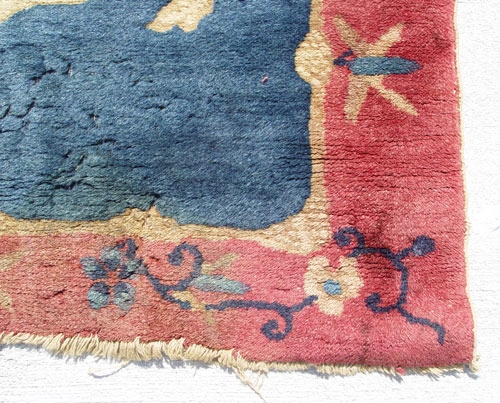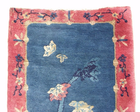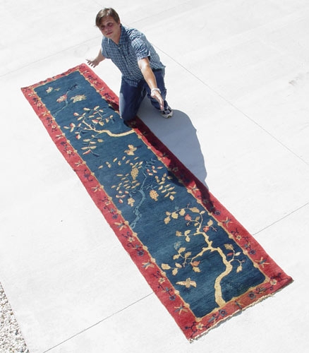CHINESE ART DECO ERA CARPET RUNNER: Blue and burgundy with branch design, 11' 4'' long x 30'' wide.