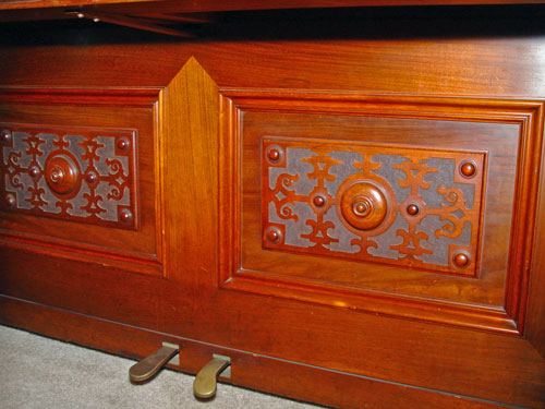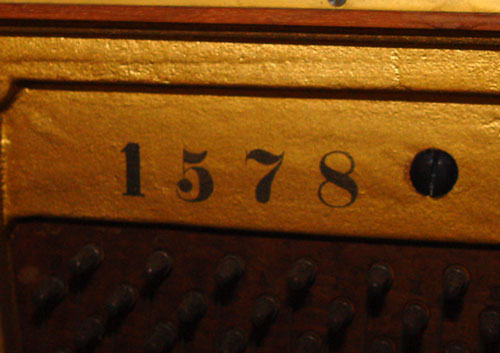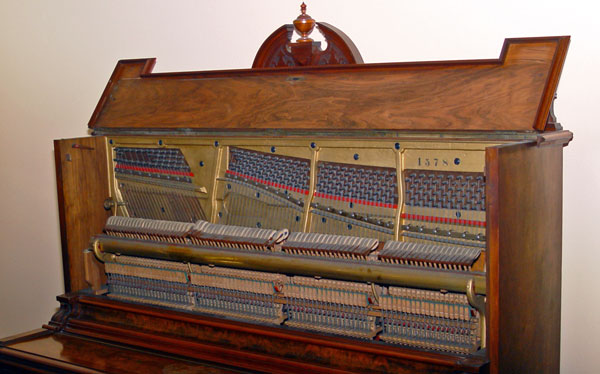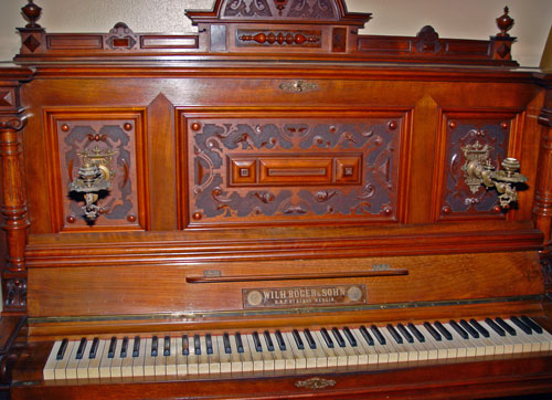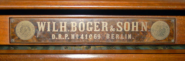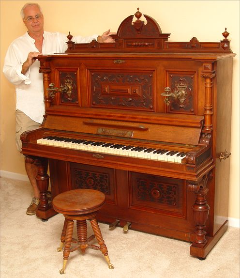 GERMAN VICTORIAN RENAISSANCE UPRIGHT PIANO: High style walnut case with ormolu and candle sconces. Manufactured by Wilh. Boger & Sohn Germany. DRPN No. 41069. 85 ebony & ivory keys. Measures 67'' high x 59 1/2'' wide x 26'' deep. Comes with glass ball & claw piano stool. Stool measures 18'' high x 19'' dia.