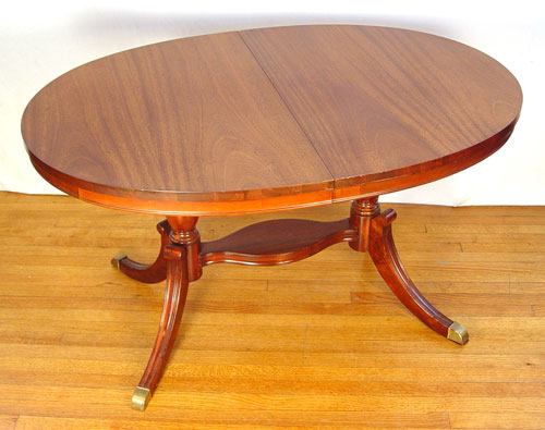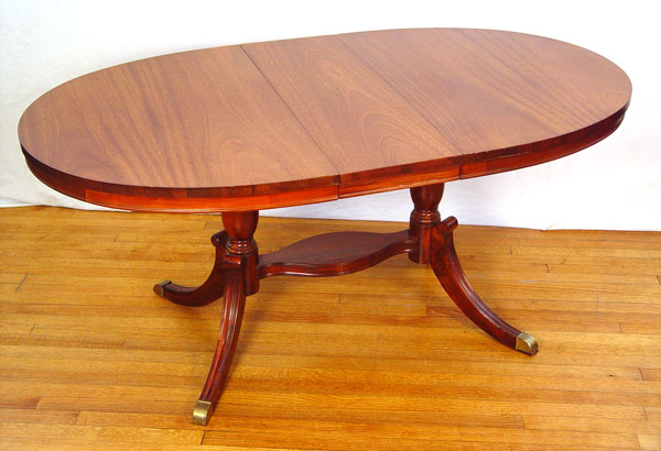 MAHOGANY OVAL DINING TABLE: Jefferson Woodworking Co. double pedestal supported by stretchers. Measures 29 1/4'' high x 66'' x 38'' with 17'' leaf intact.