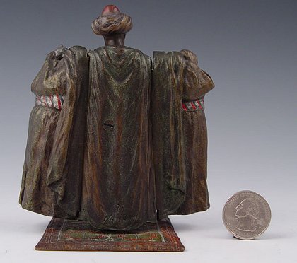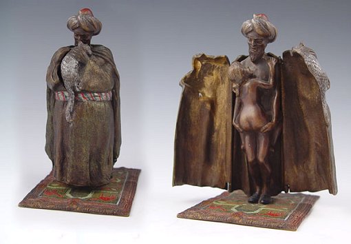 BERGMAN MECHANICAL ARAB/NUDE BRONZE WITH CAT: Arab's coat opens to reveal a young lusty maiden; 4 1/2'' h., signed, Bergman mark. Est. $500/800**