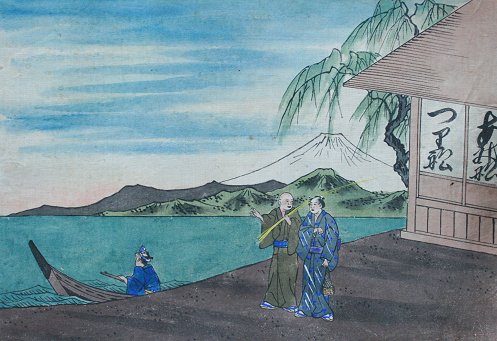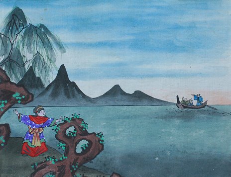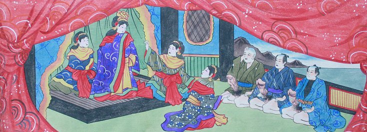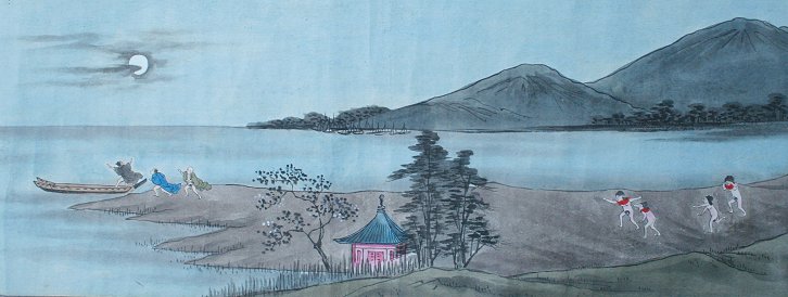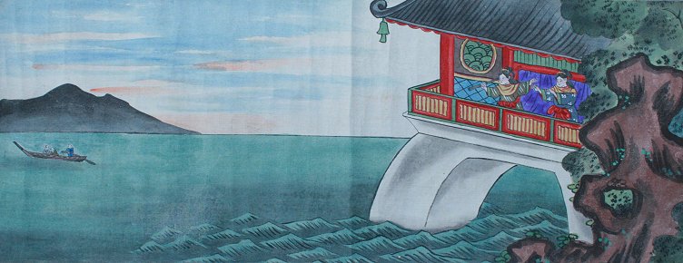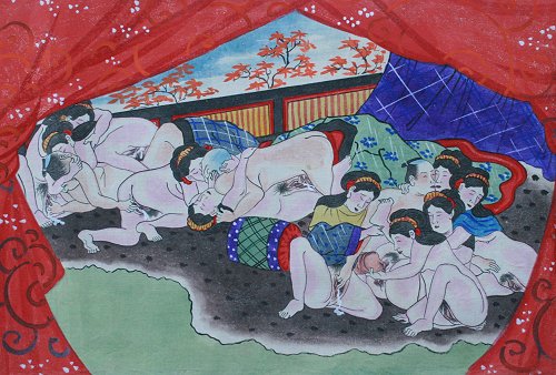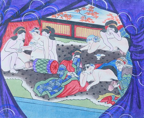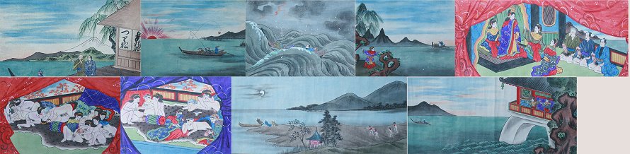 EROTIC ORIENTAL SCROLL PAINTING: Probably late 19th or early 20th C., depicts an erotic story of fisherman getting caught in a storm and brought to an island of only female beauties, 167'' x 10''. Est. $2000/4000**