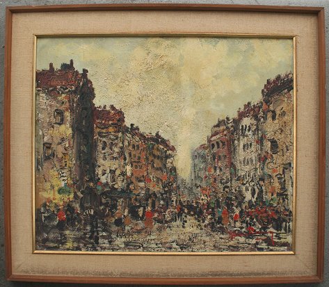 REMY, Jean, (French, 20th C.): Parisian Street Scene, OIL/C, 20'' x 24'', signed, framed, 2'' cracklure, several flecks. Est. $400/600**
