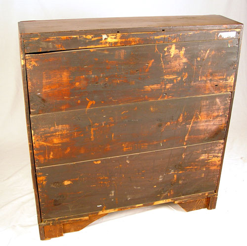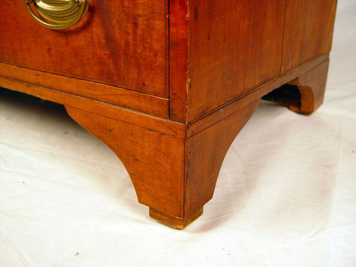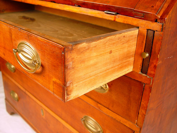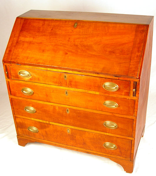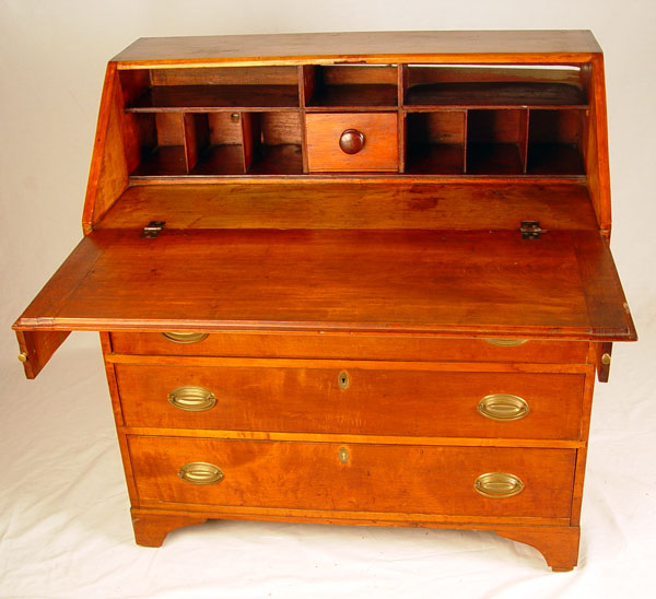 LATE 18TH C AMERICAN SLANT FRONT DESK: Cherry and birch wood. Slant front lowers to expose the later pigeon holes and drawer. Replaced pulls on the four full length drawers. Bracket feet. 40 1/2'' x 37 3/4''. x 18 3/4''.