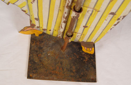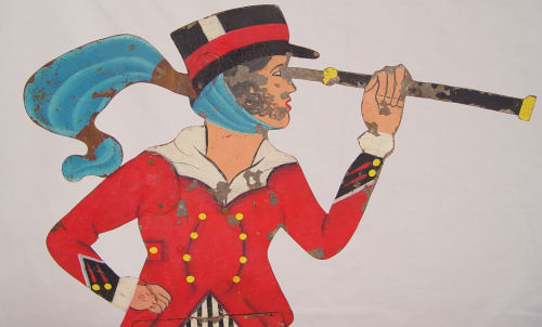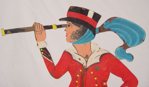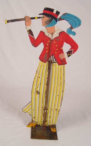 FOLK ART STEEL SILHOUETTE WEATHERVANE LADY WITH SPYGLASS: Hand painted over steel body. Complete with display stand. Measures 32 1/4'' high x 17 1/4'' wide. Please note minor loss of paint in isolated spots. Age unknown.