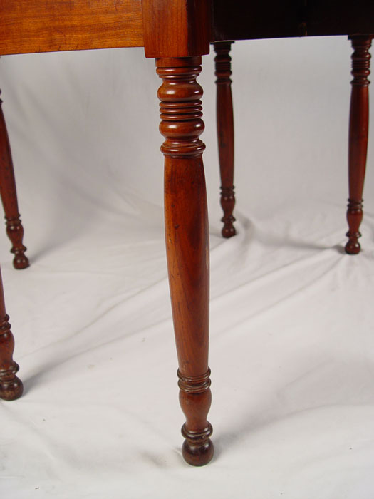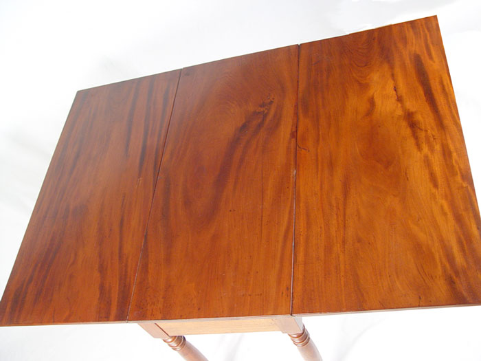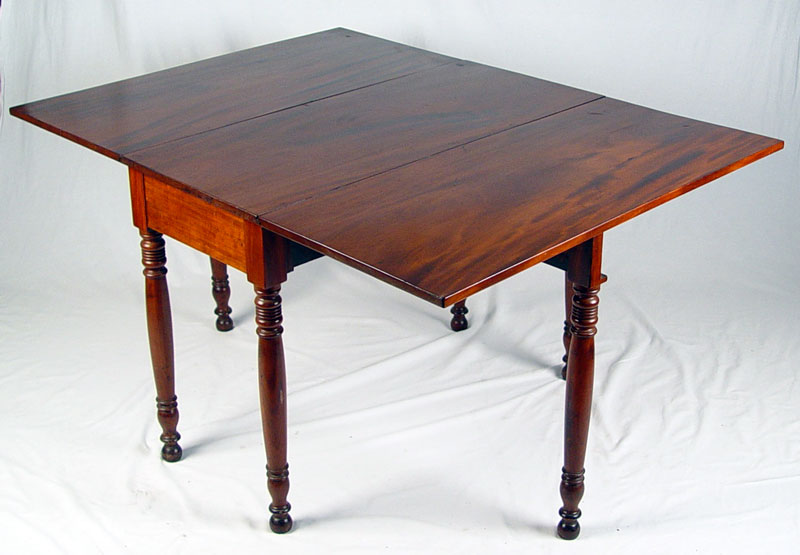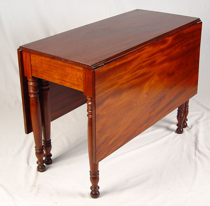 3 BOARD MAHOGANY DROP LEAF TABLE: Fine swing leg table, turned legs and extends to 56'' long. Mid to late 19th century. Measures 28 3/4'' high x 40'' long x 20'' wide closed. Each side panel measures 18''.