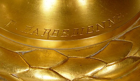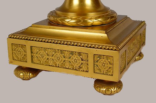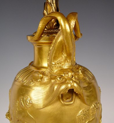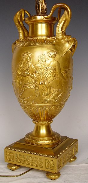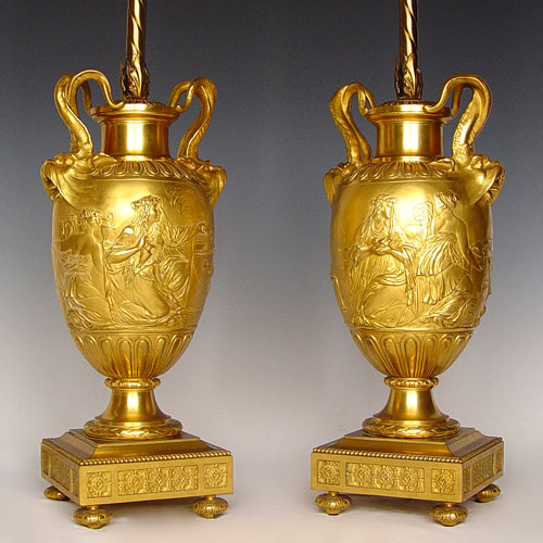 PAIR 19th C FRENCH BRONZE URNS by FERDINAND BARBEDIENNE: Mounted as lamps. Measure 26'' high to top of urn, 46'' to top of finial x 10'' dia at widest point.