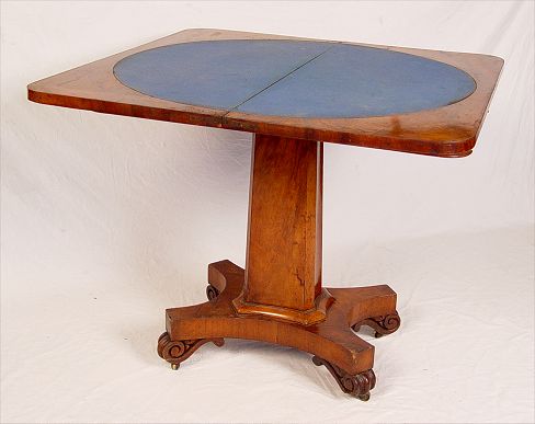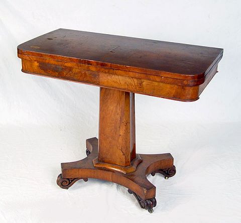 EARLY 19TH C ENGLISH GAME TABLE: Single pedestal, flip top. Please note worn condition. Measures 30'' high x 36'' wide x 18'' deep closed.