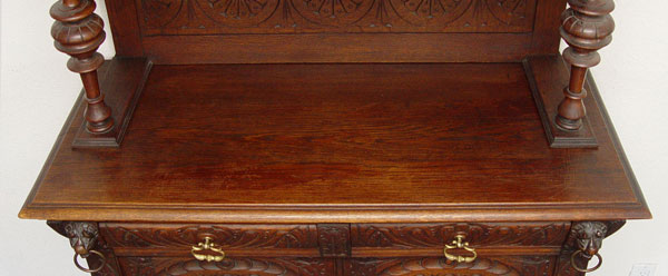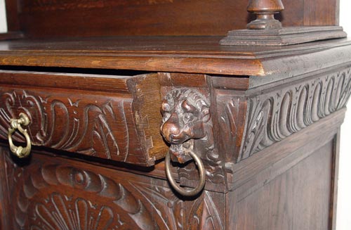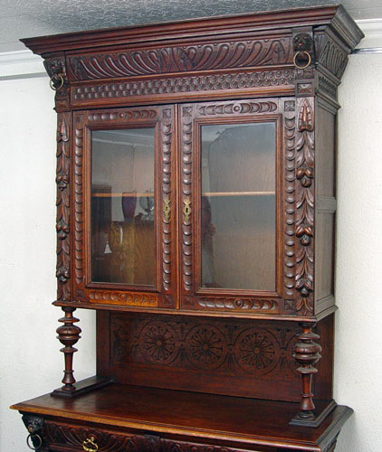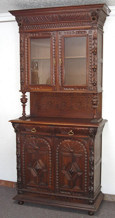 BELGIUM ORNATELY CARVED SIDEBOARD CUPBOARD: Fabulously carved walnut cupboard. Pair of ring nose lions guard the upper glass door cabinet. Relief geometric carvings and fruit and leaf carving throughout. Top and bottom pieces separate for shipping. Measures 93 1/2'' high overall x 44 1/4'' wide x 20'' deep.