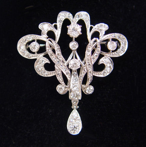 18K ANTIQUE 3.25 CTW DIAMOND BROOCH / PENDANT Circa 1910-1920: 18K white gold brooch/pendant contains 40 old European round and early round single cut diamonds. 26 round rose cut diamonds. Total Weight: 3.25 Ct. Approx. The diamonds average VS in clarity and G-H in color. The diamonds are prong set. Locking bar pin closure and hidden fixed bail. The diamonds are bead, prong and bezel set. Weight: 10.6 grams.