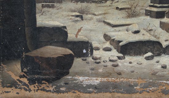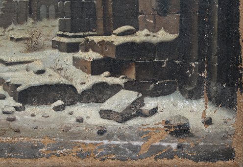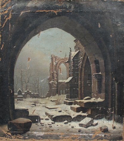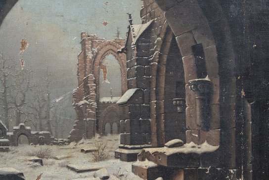 SNOWY CLOISTER RUINS EUROPEAN PAINTING: In the style of Hasenpflug et al, Oil/Canvas, 19'' x 17'', canvas appears to be late 19th C., unframed. Condition - Scattered abrasions, punctures and flaking paint throughout, needs restoration. Sold as is.